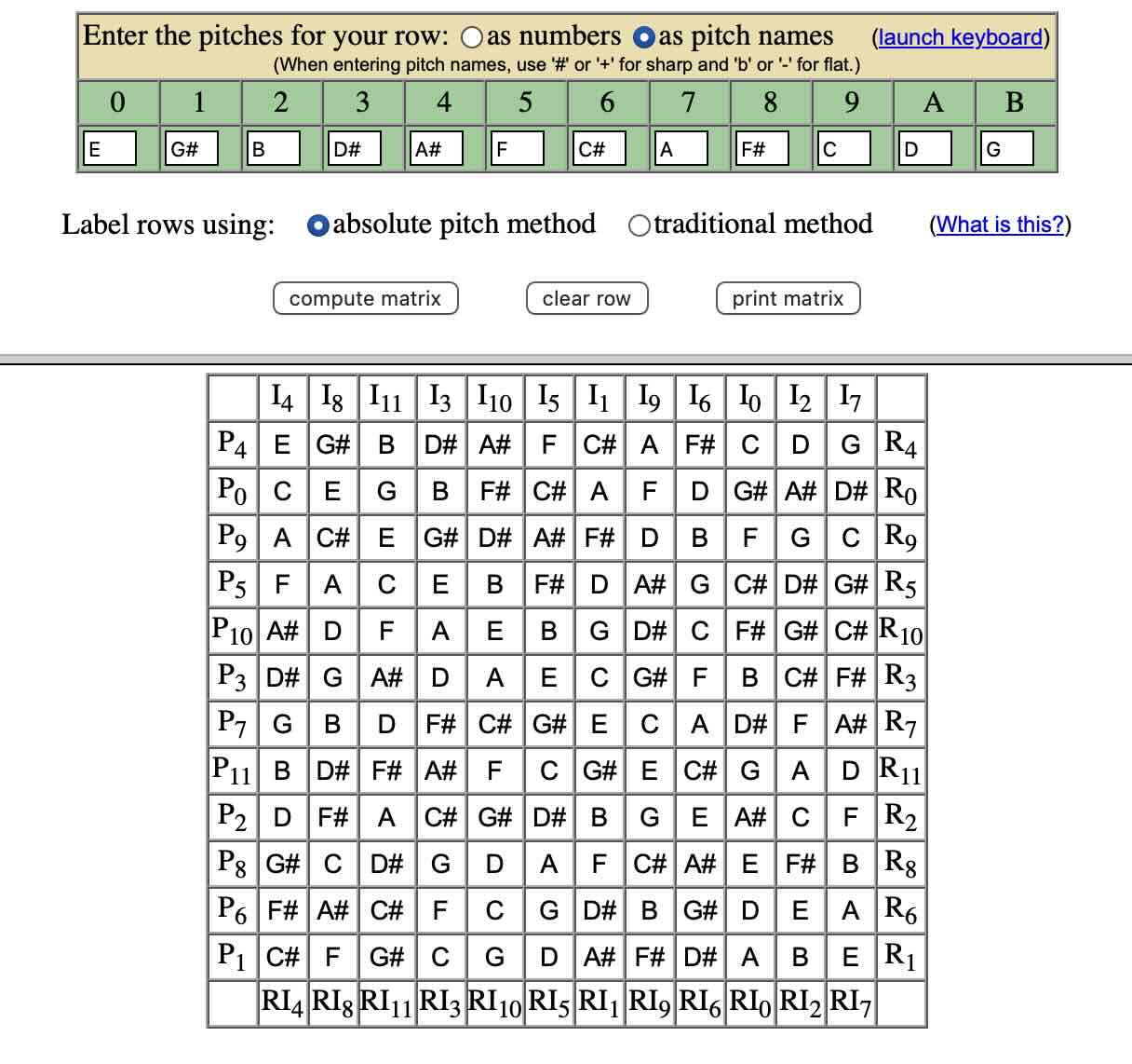If you're lke me, you're thinking "I would love to embrace Total Serialism and create Dodecophonic Compositions in the comfort of my own home. But gee whiz, writing out my sets sure take a long time! Well, worry no more with this handy dandy 12 Tone Row Set Generator! Impress you loved ones with the speed in which you create your very own retrograde inversions!"